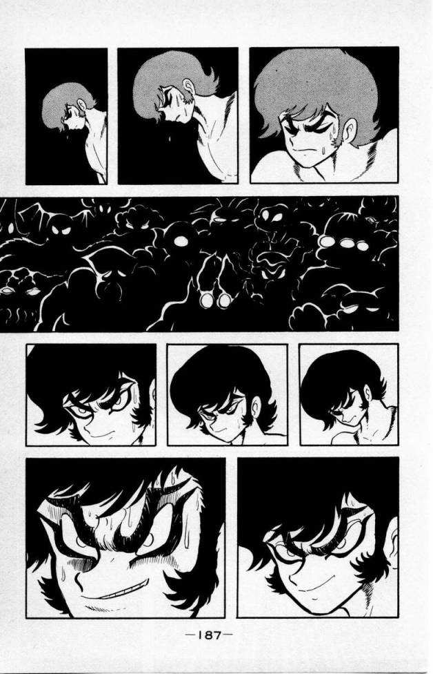 Devilman es una serie de mangas de Go Nagai. Guillermo González Hernández en su ponencia expone que la teoría de Nietzsche de la dicotomía apolínea y dionisíaca se puede aplicar perfectamente a la forma de storytelling de Devilman. Los paneles del cómic que representan la vida formal del protagonista siguen unas líneas limpias y un formato clásico donde el contorno negro delinea a los personajes y los separa del fondo; sin embargo, para mostrarte la vida del personaje en su peor forma, es decir, siendo carcomido por un demonio, el dibujo se vuelve menos perfecto, más sucio, el fondo y el dibujo principal se funden entre sí. Los mangas suelen ser pintados únicamente en tinta negra, así que esta manera de jugar con el medio y las limitaciones es extraordinariamente original.